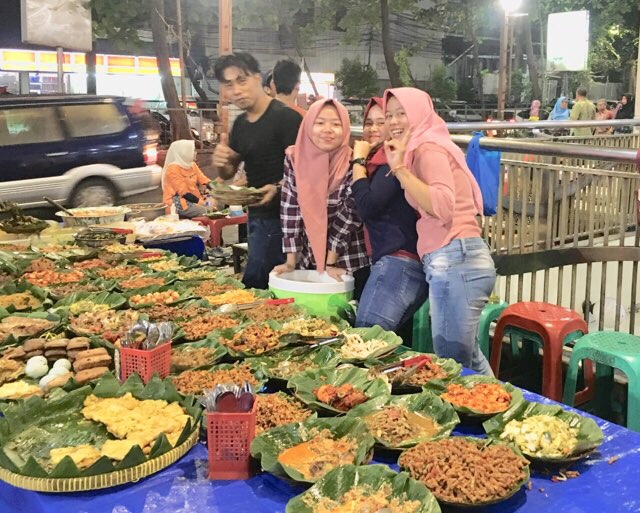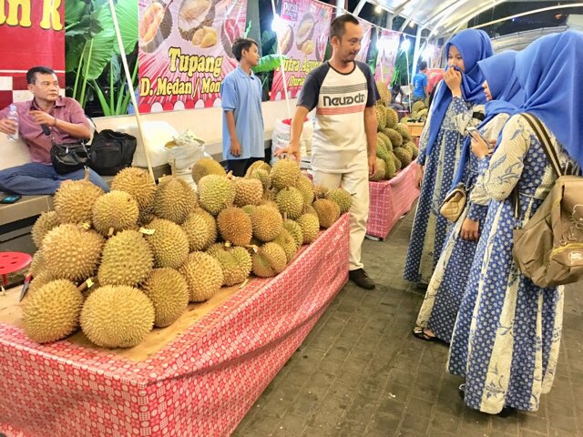その夜、バスでブロックMという繁華街にあるモールへ。ドリアが山積み?この料理はジョグジャカルタというインドネシアの京都の伝統料理。みんな写真に写りたがり?