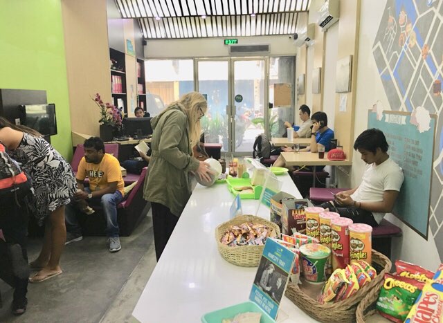 おはようございます。こちらはゲストハウスのラウンジ。朝から混んでて、座るとこないから、立ち食い?意地でも朝食食べるがめつい私?