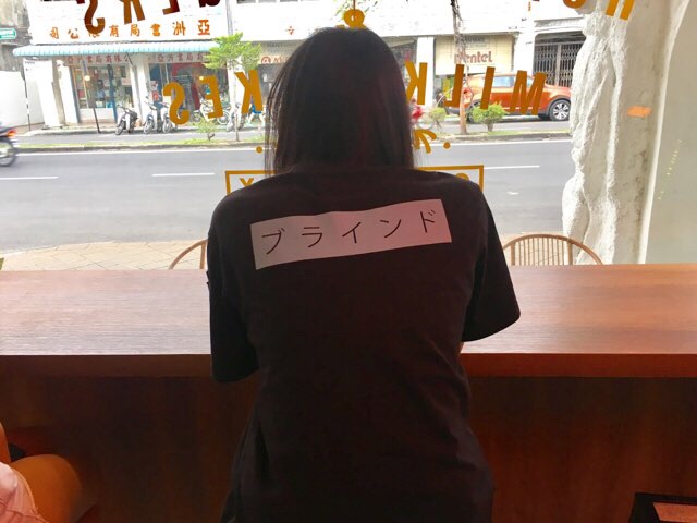 たまたま着ていた服の背中にも「ブラインド」と日本語入り!