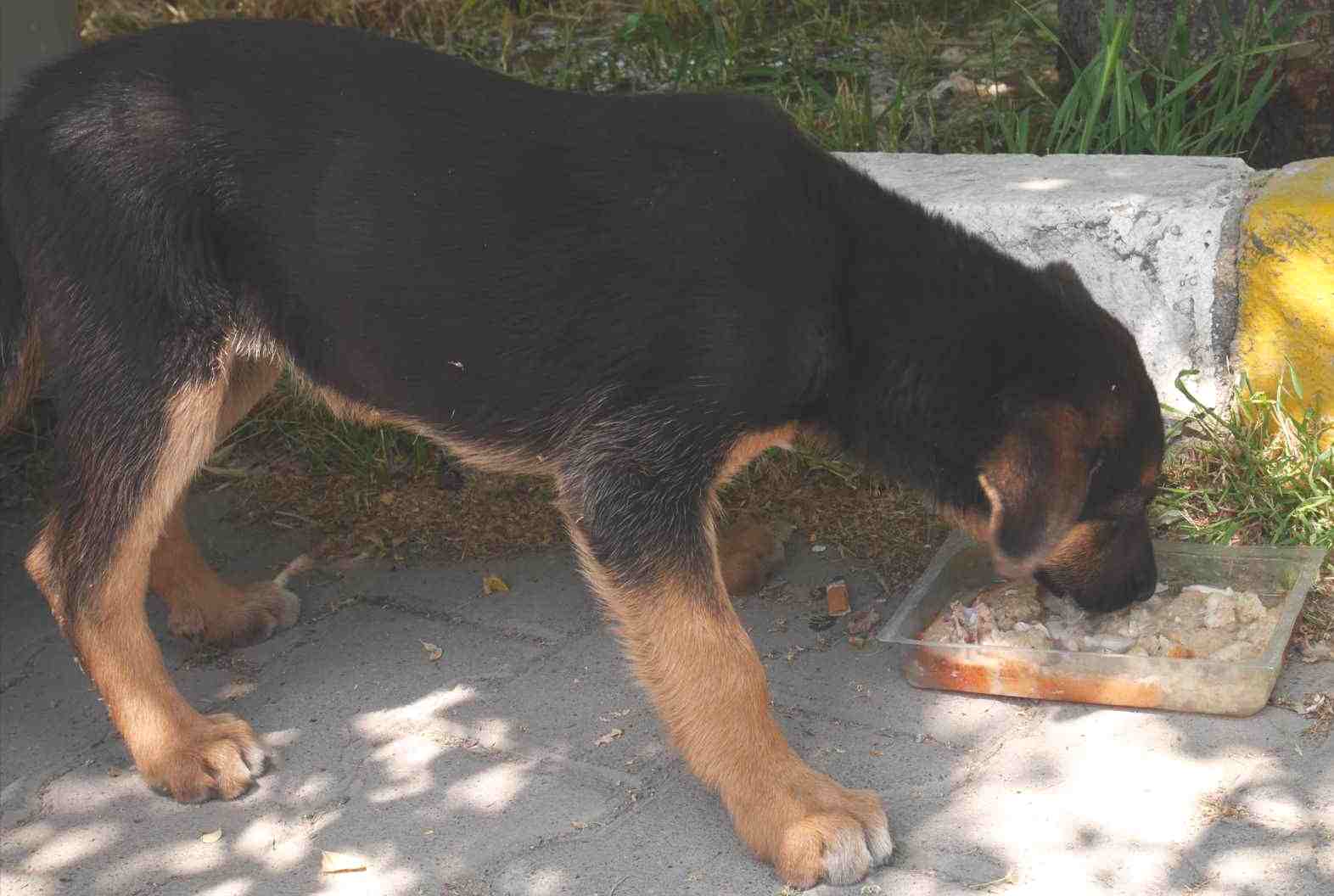 野良犬でしょうか?誰かがエサをあげてるみたい。